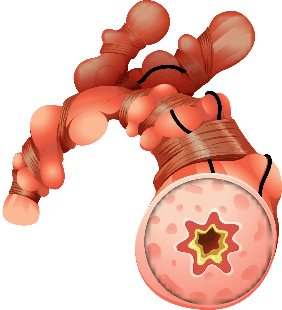 So sieht ein gesunder Bronchus aus, mit entspannten Muskeln und normaler Ausbildung der Schleimhaut.